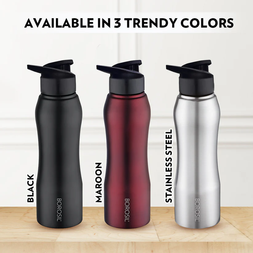 Convenient size fits in the side pocket of school, trekking or office bag, car bottle holder etcOdour free and leak proof and easy to pourFlip top lidSuitable for fridge useSuitable for cycling, camping, hiking and other outdoor sports