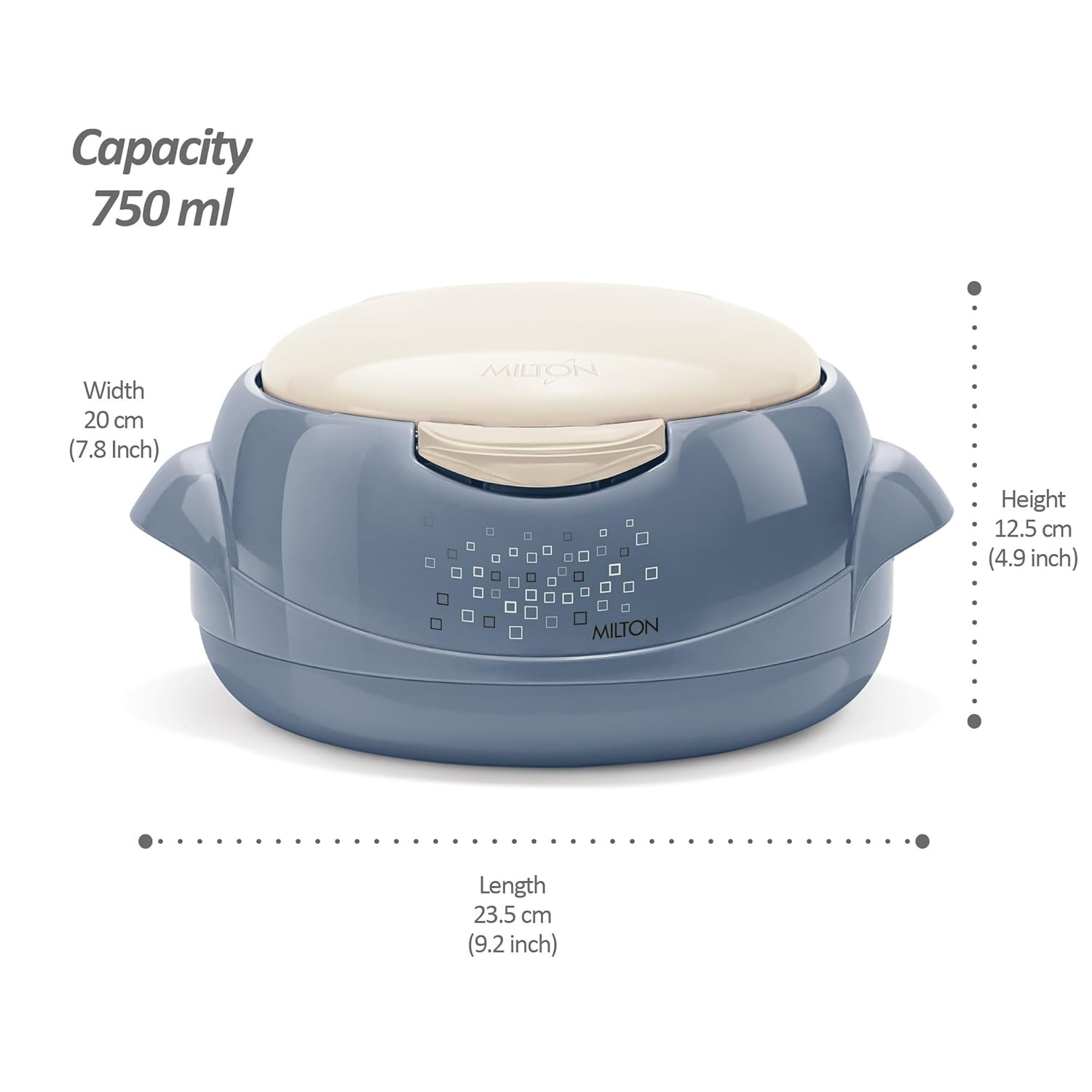 • Colour: Stone Blue; Material: Inner - Stainless Steel Outer - Plastic; Package Contents: 1 - Piece Microwow One Touch Casserole (750 ml); Product Dimension in cms (L x W x H): 25 X 12.5 X 20