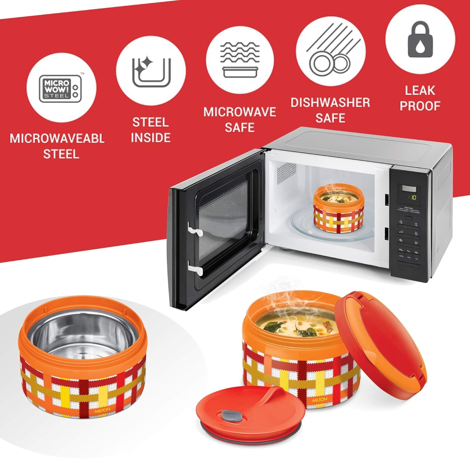 • Microwaveable leak proof containers with inner steel can be used for reheating