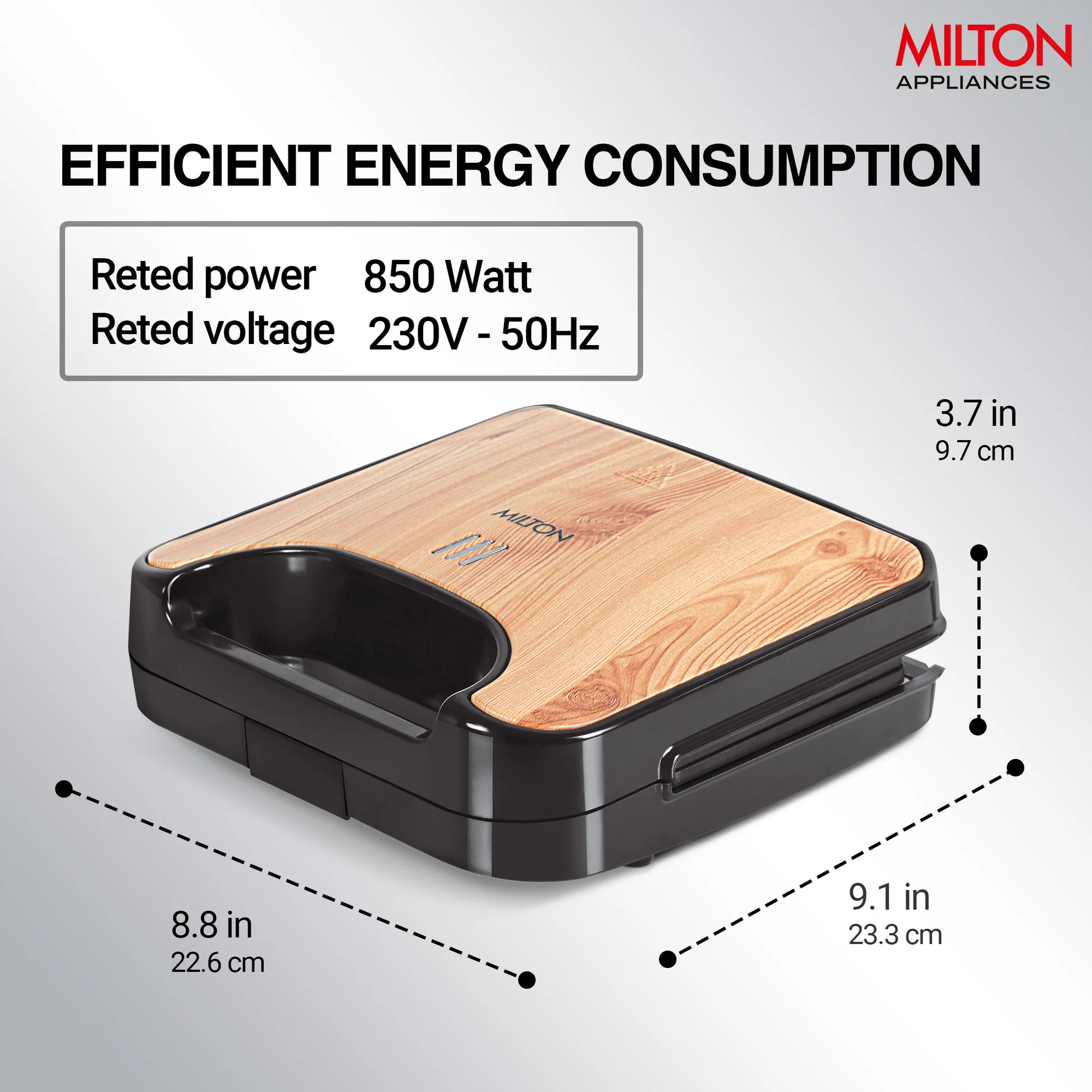 850W, Bakelite body, Wooden colour, Auto cut-off function, Detachable plates, 2 Years Warranty.
