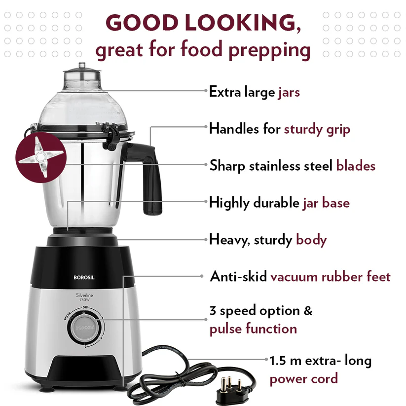 - 1.5 L blending jar with clip locking