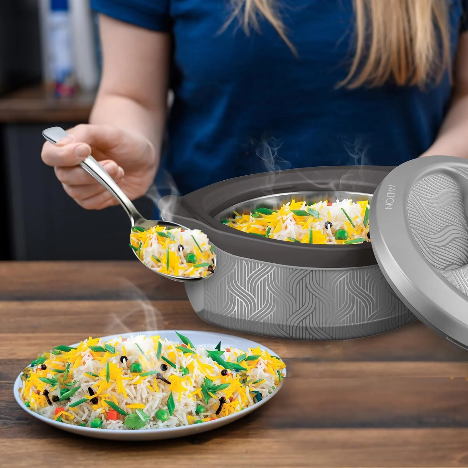 • PU Insulated Inner stainless-steel casserole keeps food hot and fresh for hours. Unique design, elegant shape and premium matt finish adds a hint of royalty to your dining and enhances your dining décorum and thus makes it a must-have casserole for your home.
