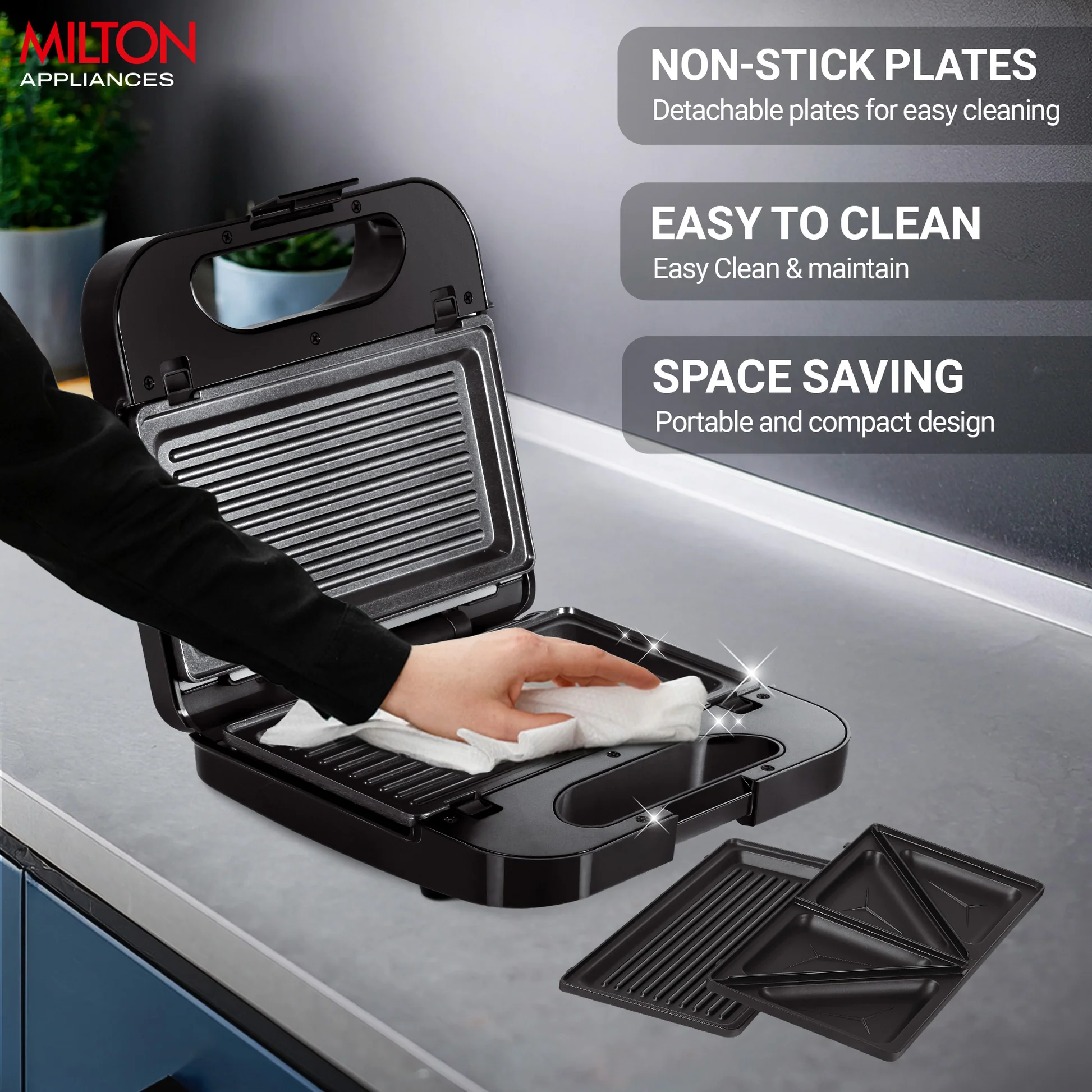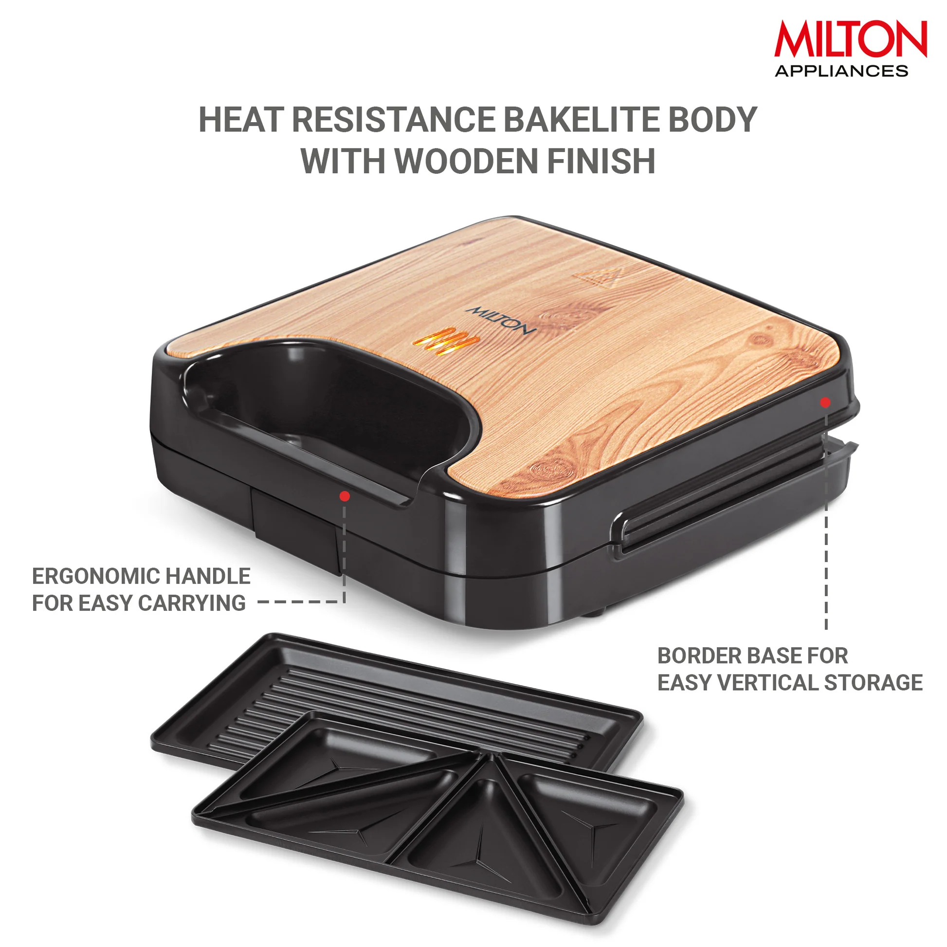 850W, Bakelite body, Wooden colour, Auto cut-off function, Detachable plates, 2 Years Warranty.