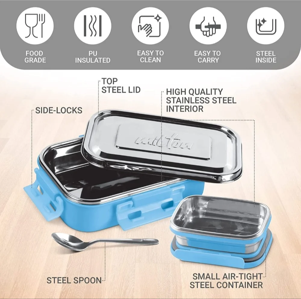 • The sleek design of the tiffin makes it easy to fit in the bag without occupying more space. Carry your home cooked food in style. Keeps food hot for hours.