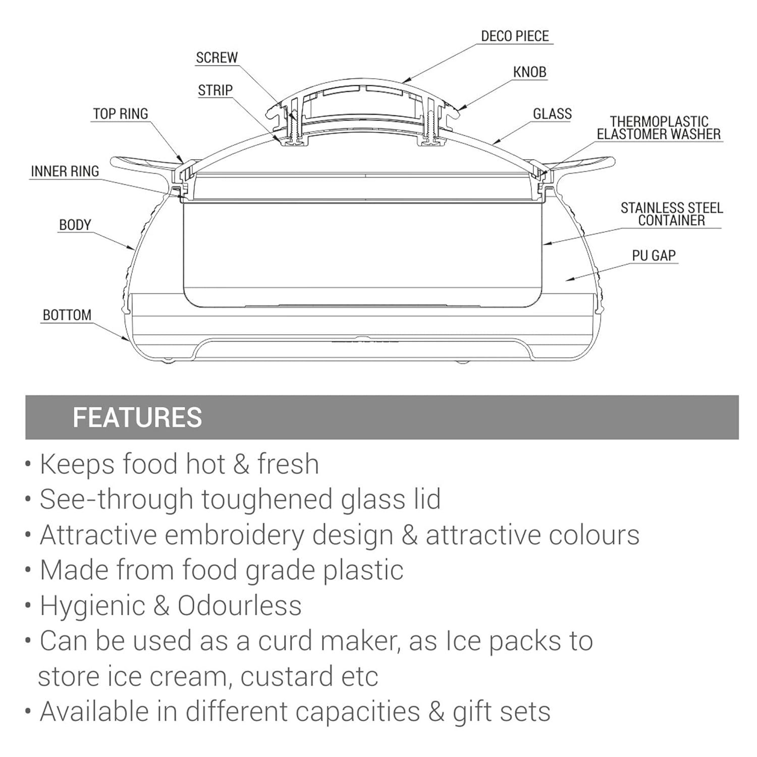 • Enhance the look of your dining table with its exclusive shape and design. It can be used for Salads, chapatti, Roti and it can also be used as a curd maker, as Ice-packs to store ice-cream, custard.