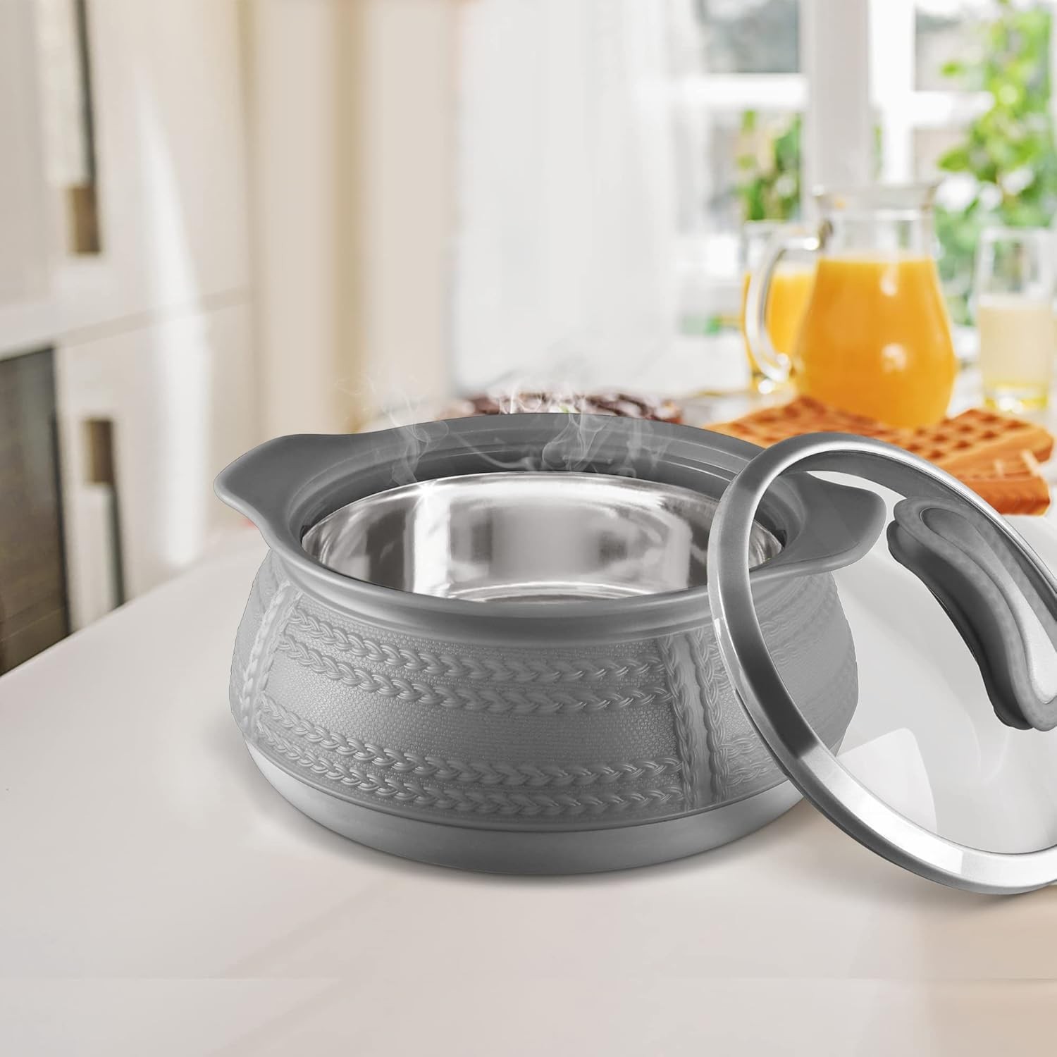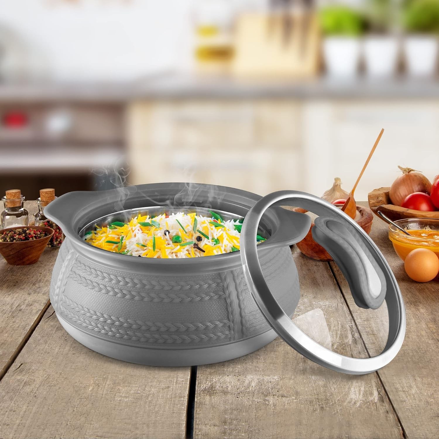• Double walled Inner stainless steel casserole keeps food hot and fresh for hours. Its sleek and attractive design (vacuum metallized / wooden prints) make it a must have to enhance your dining décor.