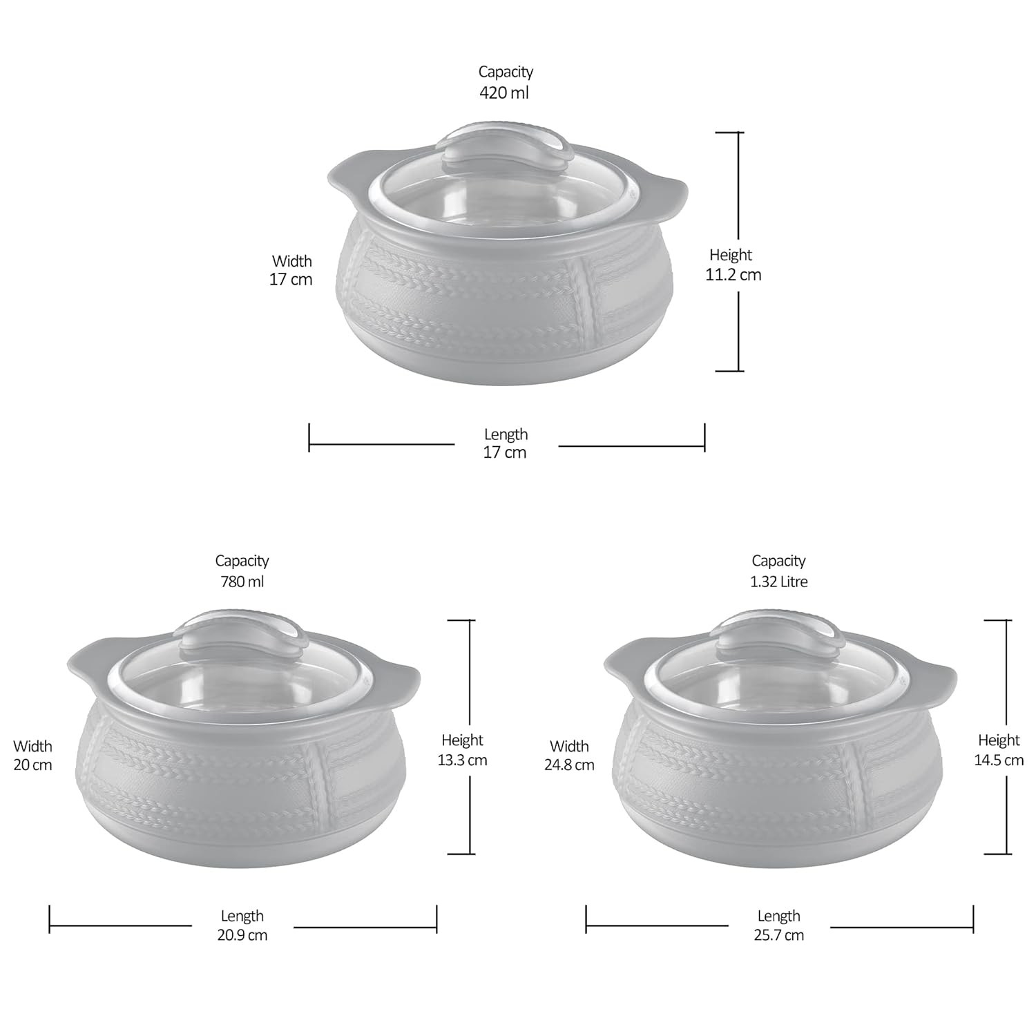• Colour: BEIGE; Material: Inner Stainless Steel; Package Contents: 3 - Pcs Weave Casserole (420 ml,780 ml, 1.32 Litres); Product Dimension in cms (L x W x H) 420 ml - (17.05 x 17.05 x 11.2), 780 ml - (20.9 x 20.05 x 13.35), 1.32 Litres (25.7 x 24.8 x 14.5).